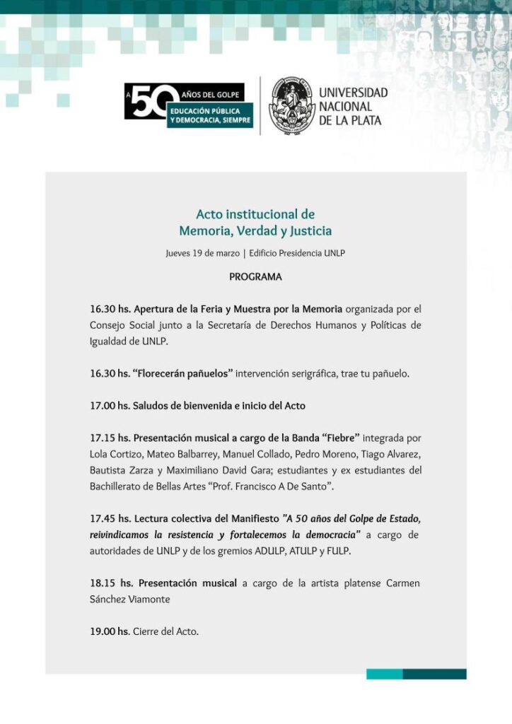La Universidad Nacional de La Plata invita a toda la comunidad a participar del Acto institucional de Memoria, Verdad y Justicia, un espacio colectivo de reflexión y encuentro para reafirmar el compromiso de la universidad pública con la defensa de los derechos humanos. La jornada contará con la lectura de un documento conjunto por parte de autoridades de la UNLP y representantes de los gremios ATULP, ADULP y FULP, consolidando un mensaje de unidad y memoria histórica.