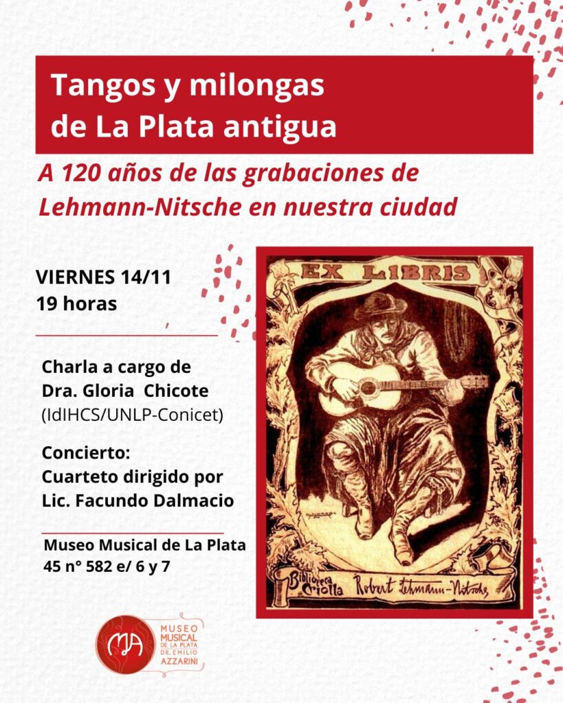 El próximo viernes 14 de noviembre a las 19hs. en el Museo Museo Musical Dr. Emilio Azzarini de la Universidad Nacional de La Plata, se llevará a cabo una charla y concierto sobre “Tangos y milongas de La Plata antigua. A 120 años de las grabaciones de Lehmann-Nitsche en nuestra ciudad”.