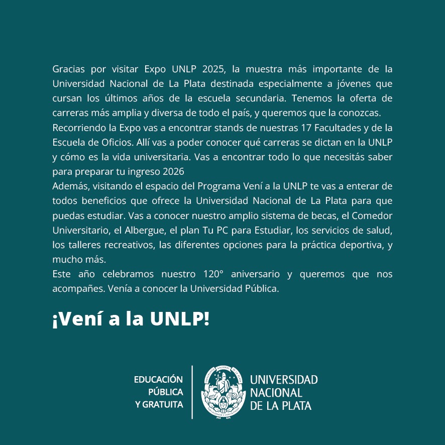 La Expo Universidad 2025 es una muestra especialmente orientada a los y las jóvenes que están cursando los últimos años de la escuela secundaria, que se realiza del 11 al 14 de agosto de 9 a 18 hs. en el Centro Cultural Pasaje Dardo Rocha (calle 50 e/ 6 y 7).