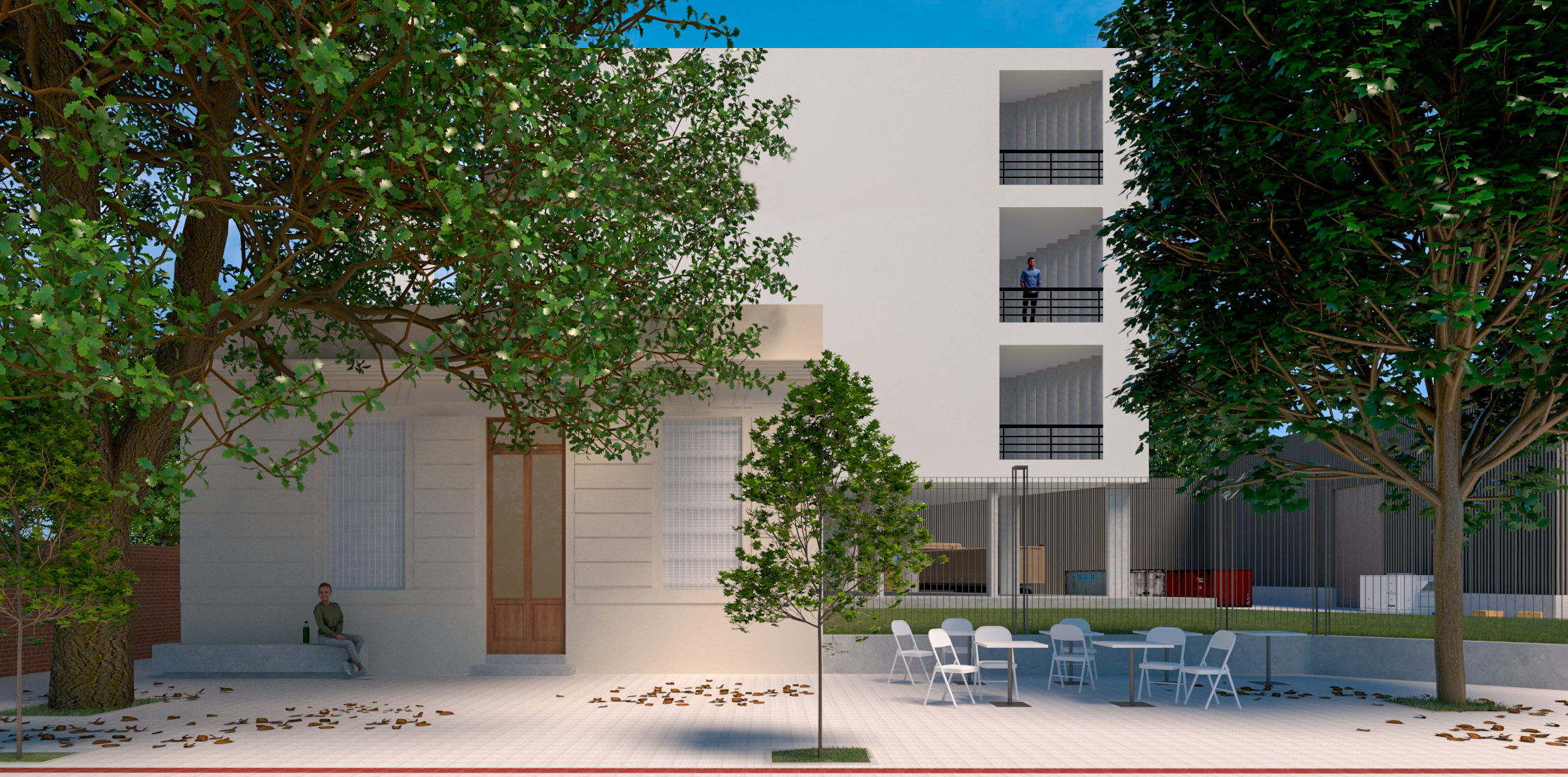 El volumen principal, constituido por los salones comedores en planta baja y alta, de geometría pura, propone una terraza con vistas largas hacia el patio de la facultad y el Hipódromo de La Plata. El prisma que comprende el área de apoyos de los salones presentará otra materialidad y dimensiones más acotadas acorde a su función (cocina y depósito), es el elemento que separa el salón comedor de la medianera existente.