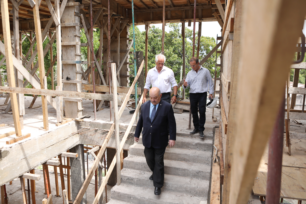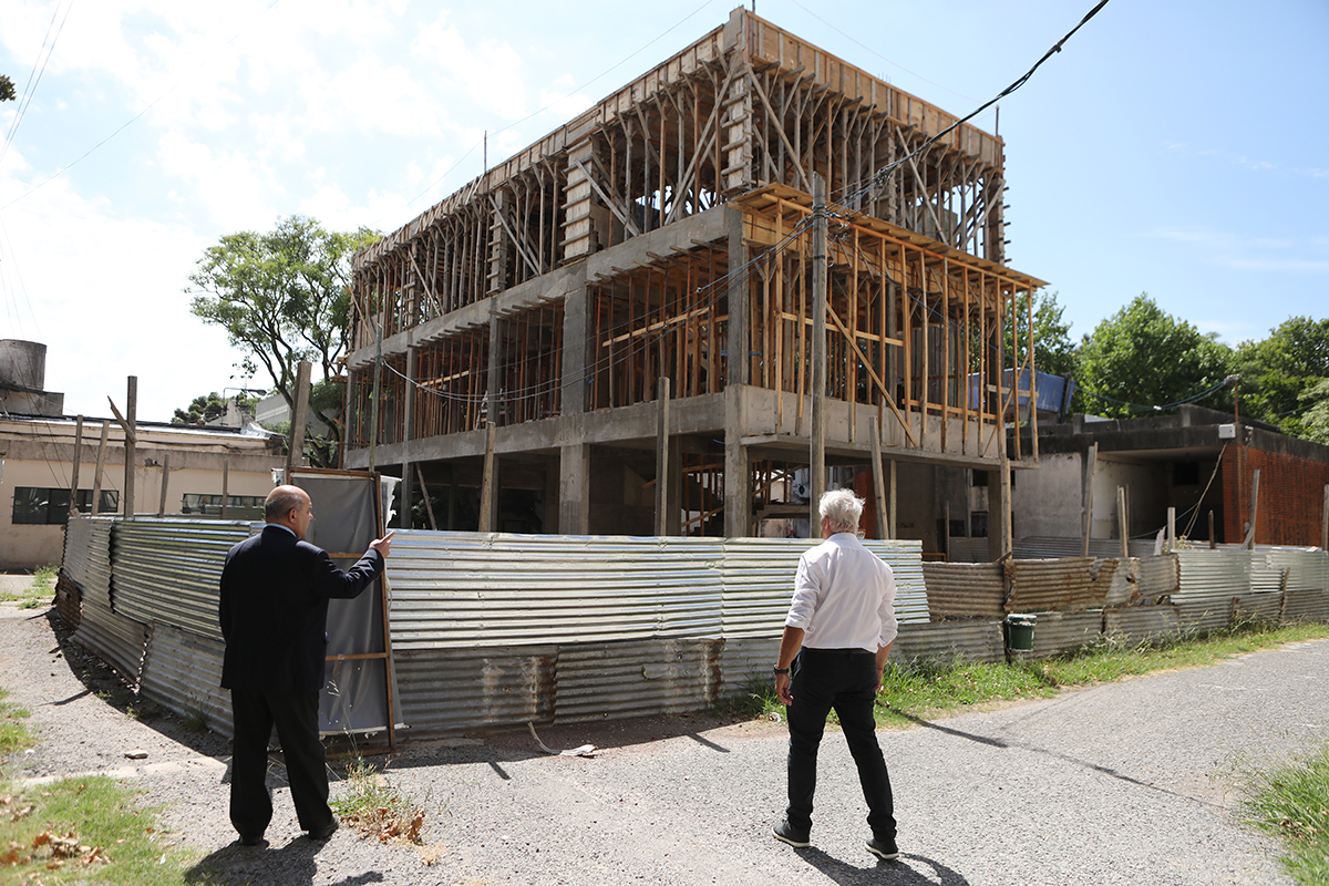 Tauber se reunió con el decano de Veterinarias, Marcelo Pecoraro, para recorrer los trabajos del nuevo complejo de aulas y laboratorios emplazado en torno su plaza central de la unidad académica de calle 60. Se trata de la primera etapa del proyecto, desarrollada en planta baja y dos niveles superiores, que incluye áreas administrativas, aulas laboratorio, aulas comunes y un auditorio.