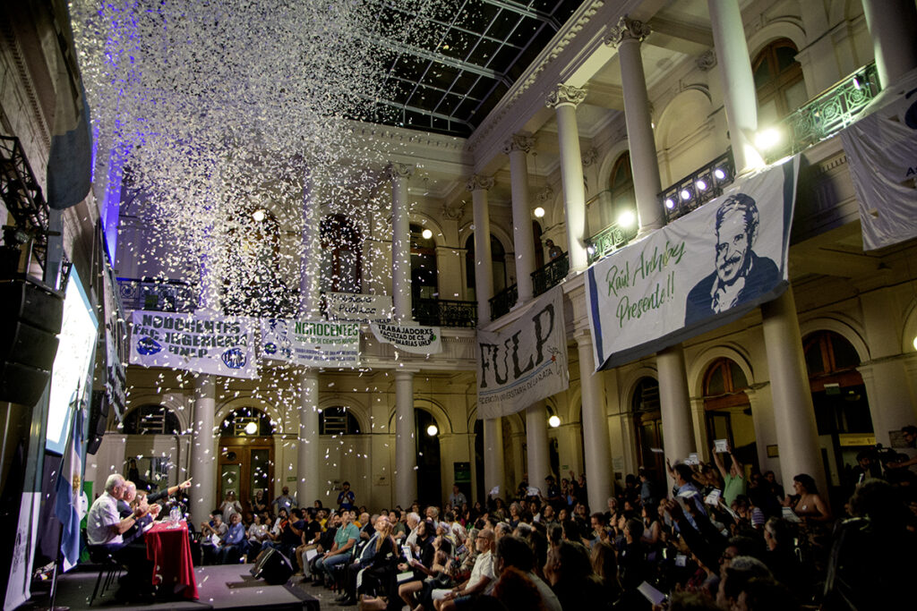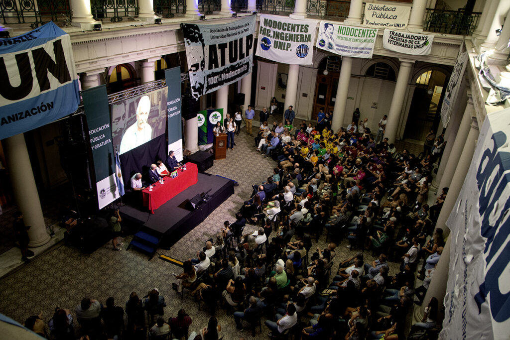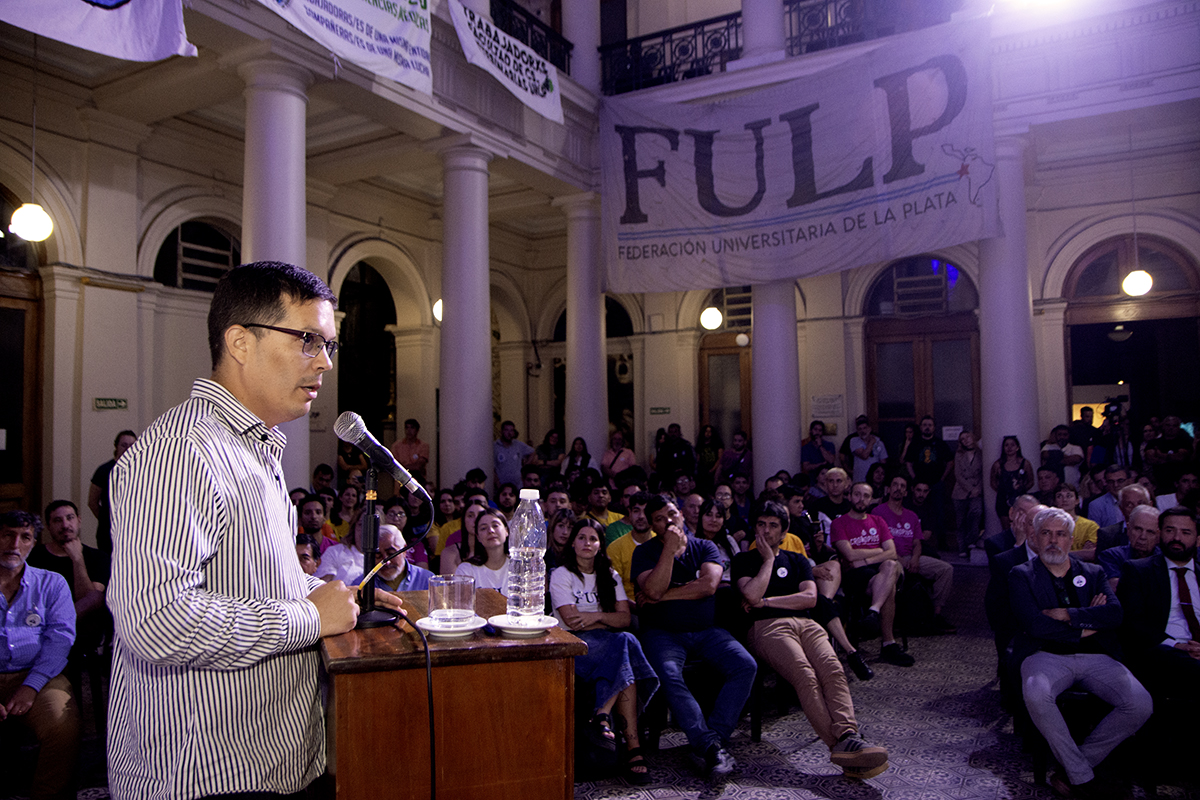 “Me pone contento que hayamos llenado el patio para recordar a Raúl. Su gran esfuerzo fue aportar para construir una universidad que piense en su pueblo”, señaló el vicepresidente, y añadió: “el mejor homenaje es estar peleando contra estos vientos de frente, organizarnos y saber cómo luchar. Sabemos que el futuro nos interpela y que Raúl nos empuja desde atrás con la bandera de la universidad pública”