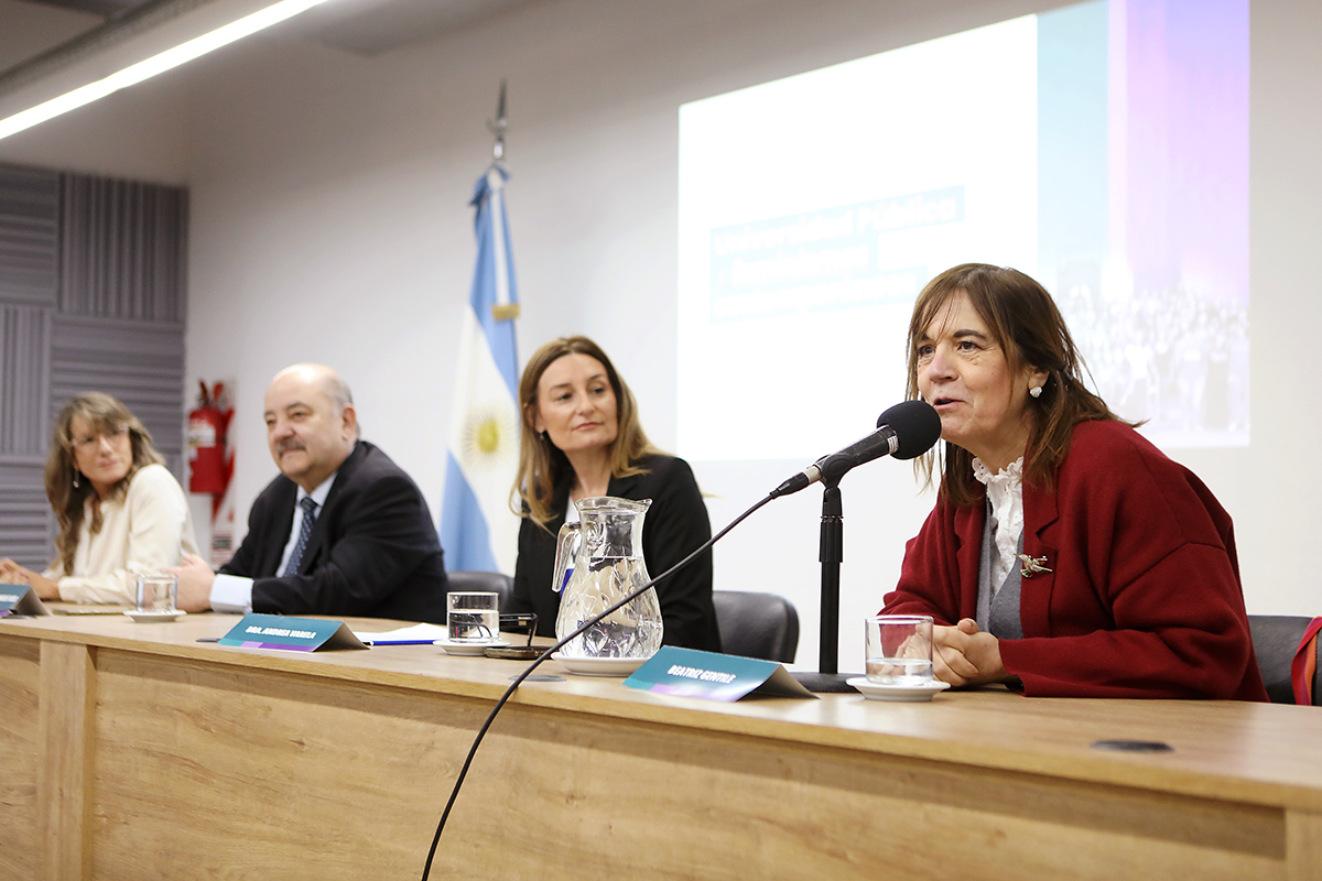 El vicepresidente Académico, Fernando Tauber, acompañado por la vicepresidenta Institucional, Andrea Varela; la secretaria de Derechos Humanos y Políticas de Igualdad, Verónica Cruz; junto a Beatriz Gentile, coordinadora de la Red Interuniversitaria por la Igualdad de Género y contra las Violencias del CIN y rectora de la Universidad Nacional del Comahue, encabezaron el acto inaugural.