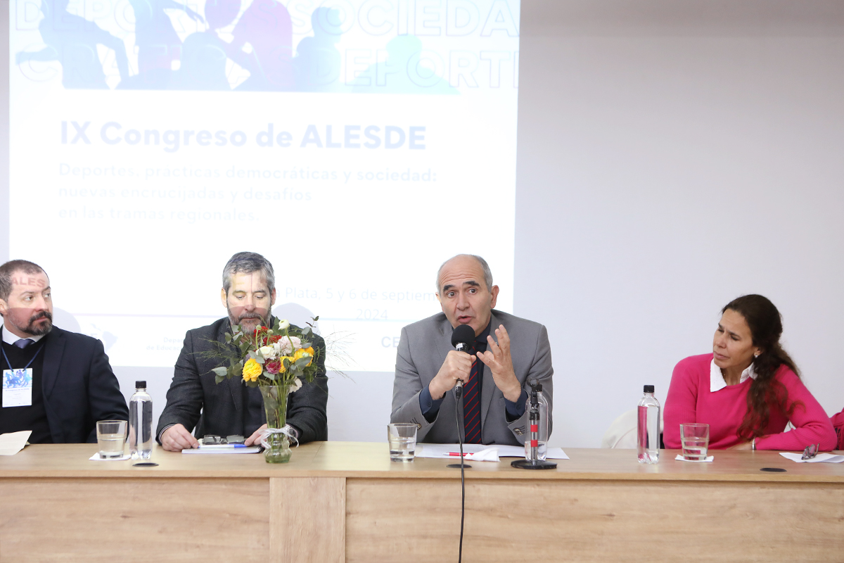 Durante el acto de apertura, el titular de la UNLP estuvo acompañado por el vicedecano de la facultad de Humanidades y Ciencias de la Educación (FAHCE), Martín Legarralde, el director general del Congreso, Jorge Saraví, el presidente de ALESDE, Renato Marques, y la directora del departamento de Educación Física de la FAHCE, Cecilia Taladriz.