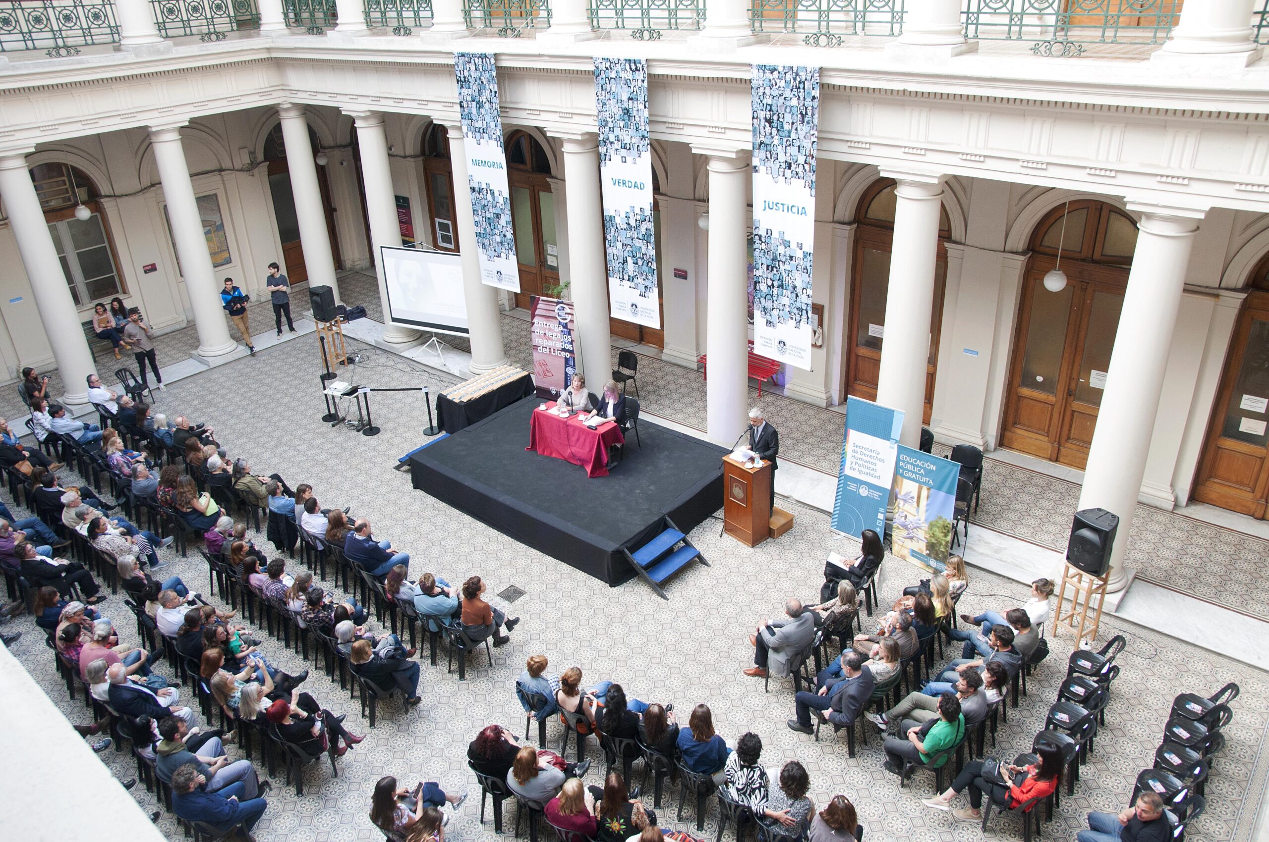 El acto homenaje tuvo lugar en el patio central del Rectorado y estuvo encabezado por el presidente de la UNLP, Martín López Armengol. Lo acompañaron la secretaria de Derechos Humanos y Políticas de Igualdad, Verónica Cruz; el secretario Académico, Aníbal Viguera; el prosecretario de Pregrado, Darío Esteves y la directora del establecimiento educativo, Julieta Miranda.
