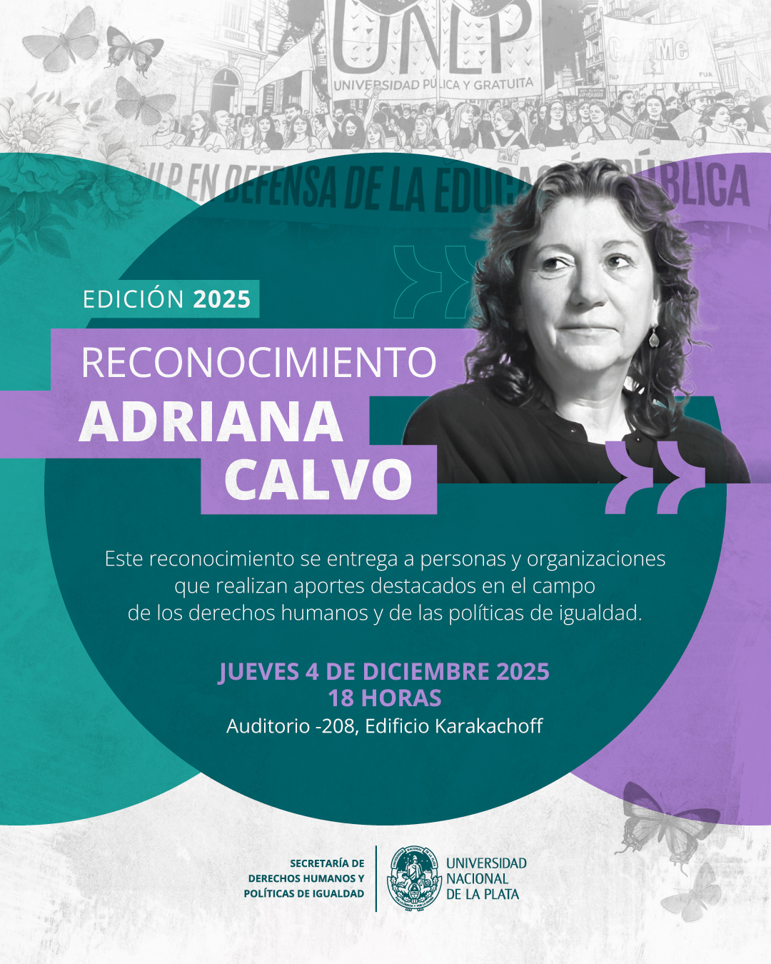 El próximo jueves 4 de diciembre, la Universidad Nacional de La Plata, a propuesta de su Secretaría de Derechos Humanos y Políticas de Igualdad, otorgará el reconocimiento Adriana Calvo. El acto se llevará a cabo a las 18:00 horas en el Auditorio (-) 208 Segundo Subsuelo, del Edificio “Sergio Karakachoff”.