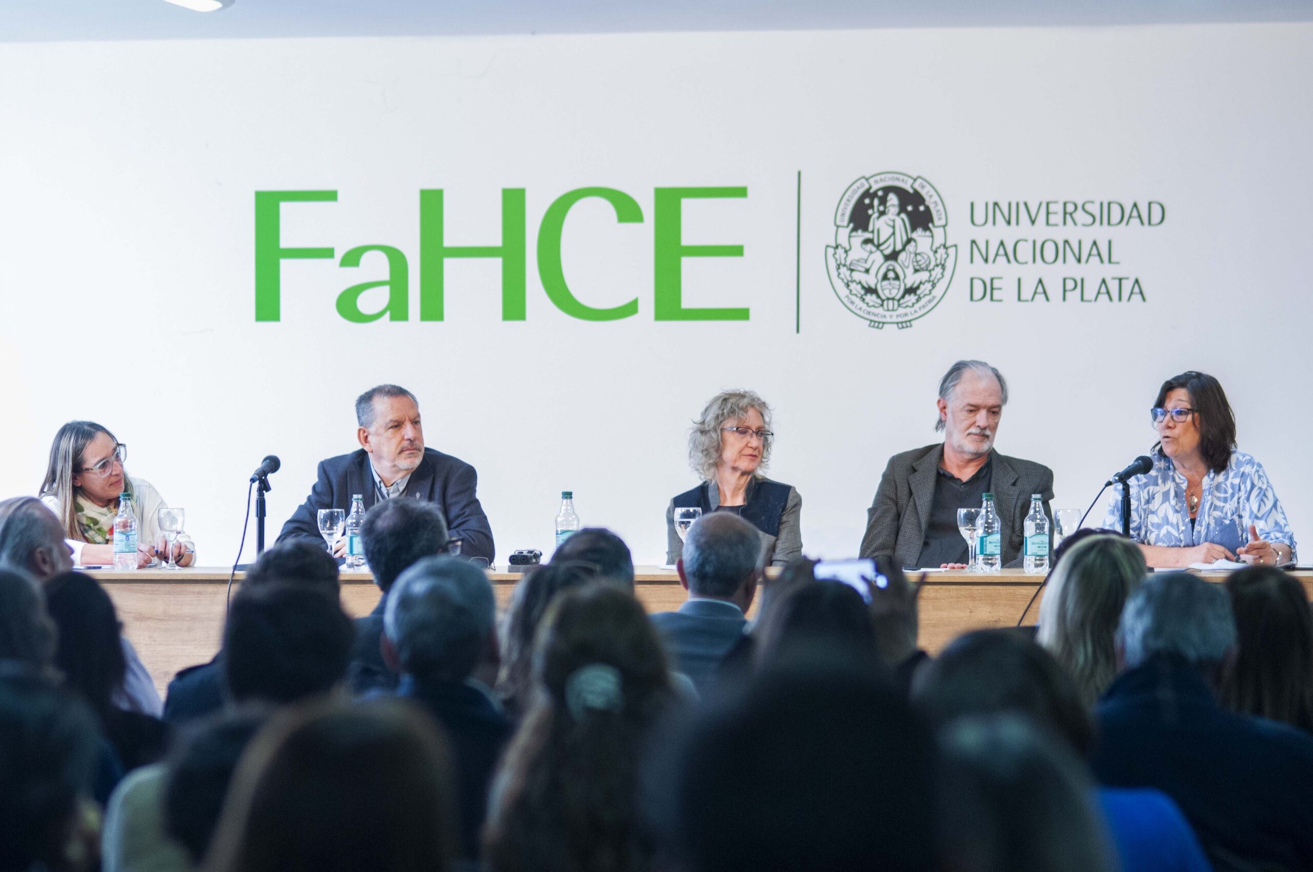 El presidente de la Universidad Nacional de La Plata, Martín López Armengol, junto a la decana de la facultad de Humanidades y Ciencias de la Educación, Ana Julia Ramírez, y el secretario Académico de la UNLP, Aníbal Viguera, participaron del acto de distinción con el título Profesor Extraordinario en la Categoría de Emérito a las y los destacados docentes José Luis de Diego, Ana Barletta y Gloria Chicote.