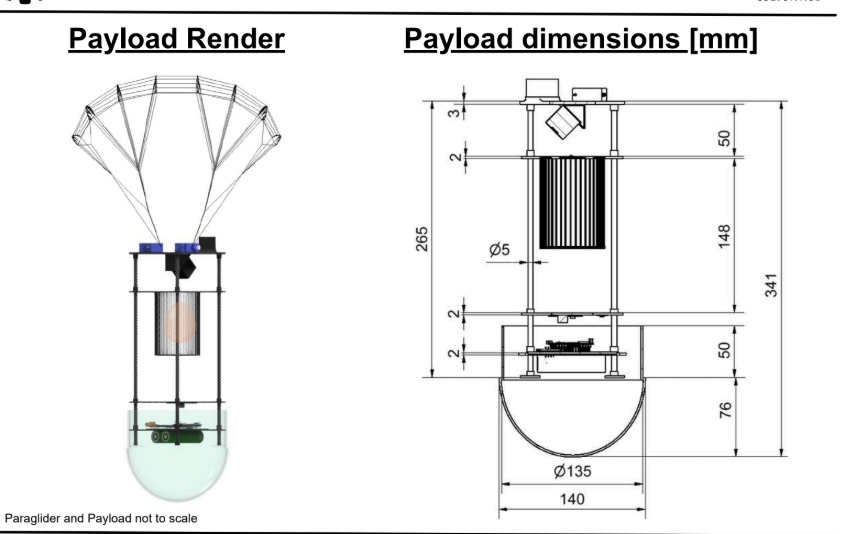 Durante toda la misión, el sistema recopila y transmite datos en tiempo real —a razón de una medición por segundo— hacia una estación en tierra. Entre los parámetros registrados se encuentran temperatura interna, voltaje y corriente de la batería, altitud, inclinación, rotación y posición GPS. Además, el dispositivo incorpora dos cámaras: una destinada a registrar la separación de la carga útil y el despliegue del parapente, y otra orientada hacia la superficie terrestre.