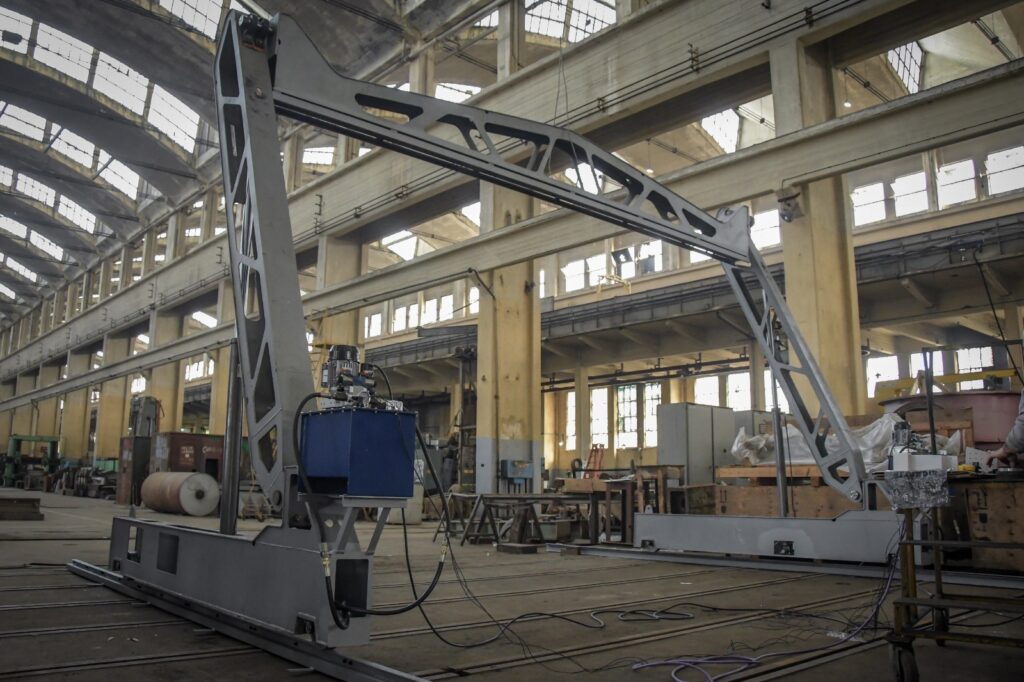 Esta estructura de gran escala, que alcanza los 6 metros de ancho y 3 metros de altura, permite imprimir viviendas de esas dimensiones y adaptar su longitud según las necesidades específicas de cada proyecto. Además, la máquina 3D cuenta con un sistema electrónico de control para poder movilizar tanto la parte hidráulica como los servomotores para el desplazamiento de los bogies y del carro horizontal.