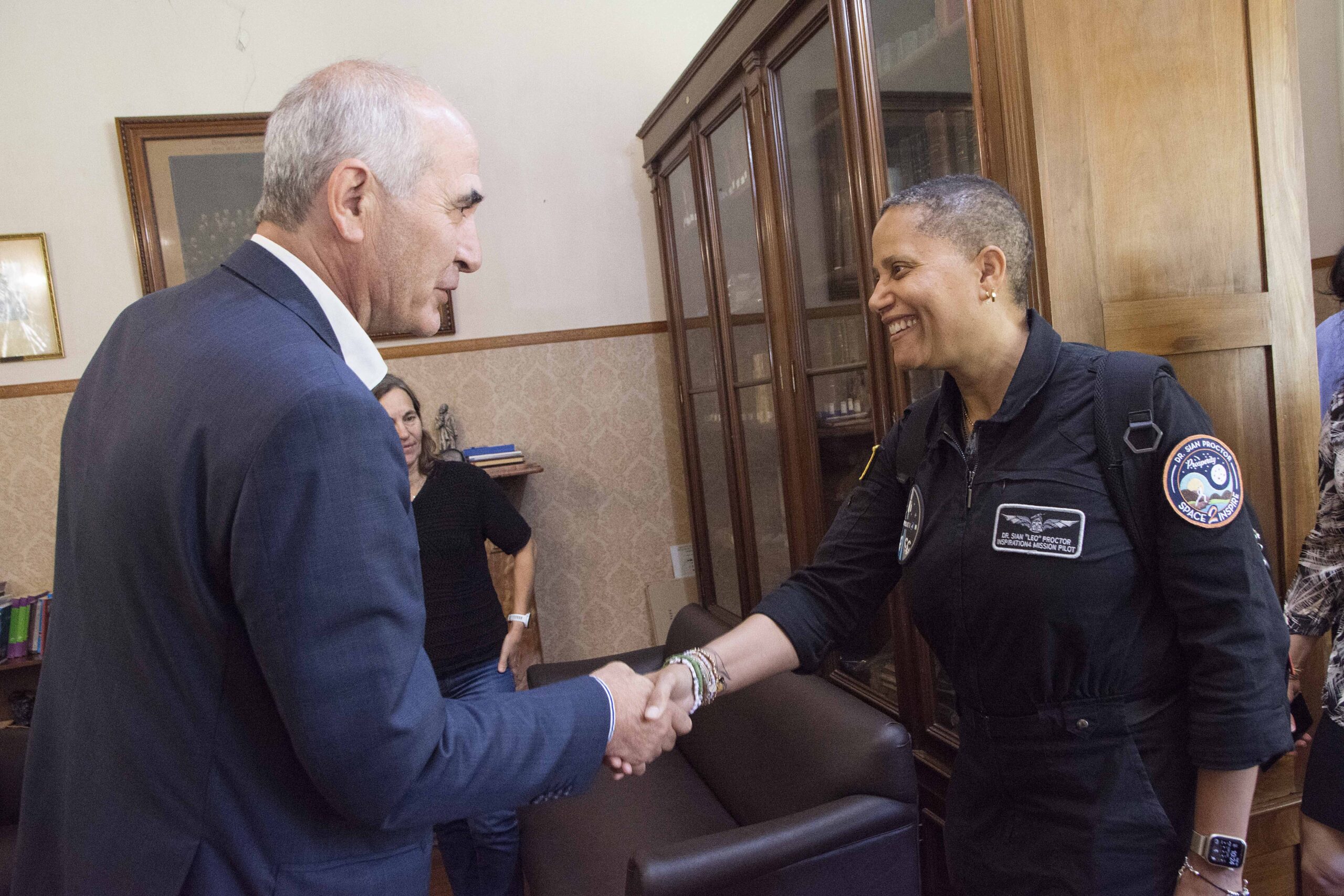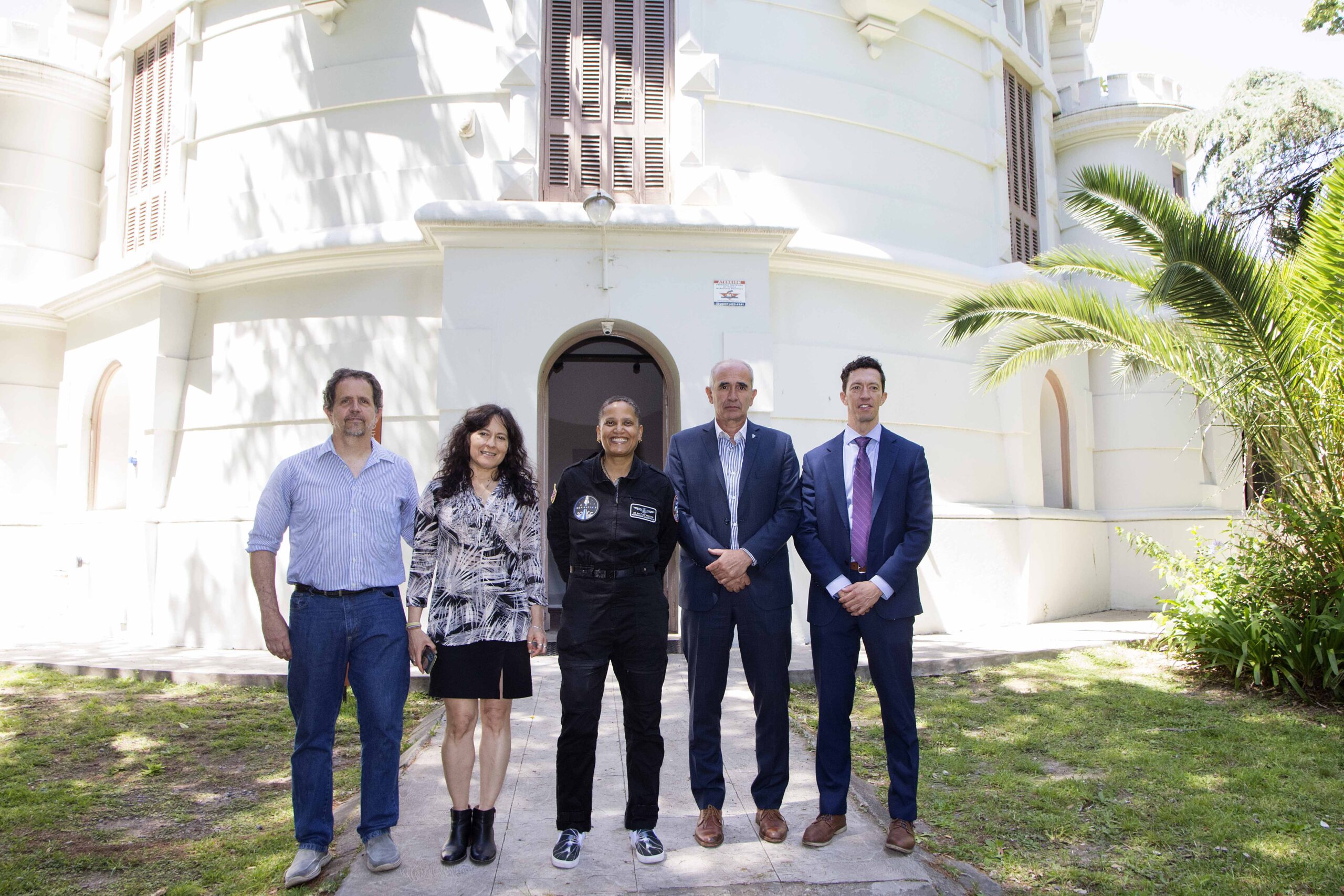 El presidente de la Universidad de La Plata, Martín López Armengol, junto a la decana de la facultad de Astronómicas de la UNLP, Amalia Meza, recibieron en la sede de esa unidad académica, la visita de la astronauta norteamericana, Sian Proctor, primera mujer afroamericana en comandar una nave espacial.