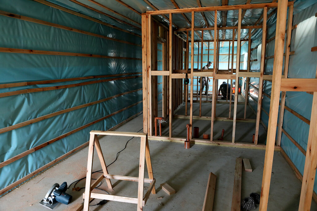 En total, en el predio ubicado en las inmediaciones de la calle 128 y 17 de Punta Lara, se están construyendo 6 casas. Tienen en promedio 3.66 x 14 metros. Habrá modelos con dos y tres habitaciones; todas con baño y cocina comedor. Son de madera con placas de OSB fenólico, aislante térmico y acústico. El revestimiento exterior está compuesto por una placa cementicia mientras que el interior es de durlock. El techo de las viviendas es de chapa a dos aguas, con alero.
