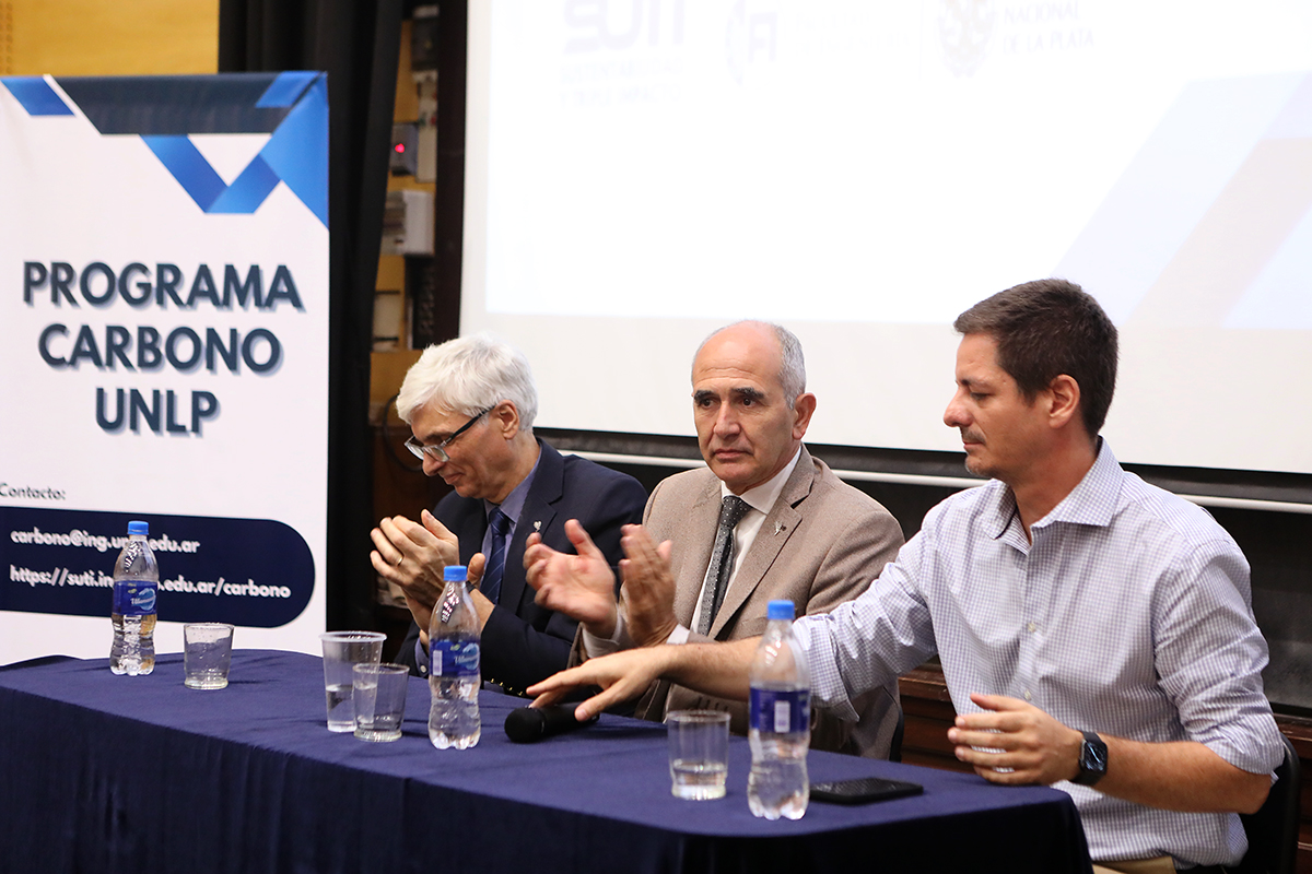Al inicio del evento, Actis destacó que la Universidad viene marcando un camino desde hace tiempo con el objetivo de ser más sustentable. En ese sentido, mencionó proyectos relacionados a la electromovilidad, la fábrica de baterías de litio y la creación del parque fotovoltaico de 10 MW de la UNLP, que permitirá reducir las emisiones de carbono. El decano indicó que el objetivo de este proyecto es “poder hacer acciones sobre los mercados de carbono, empezar a trabajar con otras facultades como Ciencias Económicas, Ciencias Jurídicas y Sociales, Ciencias Agrarias y Forestales, Ciencias Veterinarias y Ciencias Exactas, que hacen que podamos realizar estudios y certificar las emisiones de carbono de determinados proyectos. En Argentina recién se está empezando, pero es algo novedoso que se va a venir”.