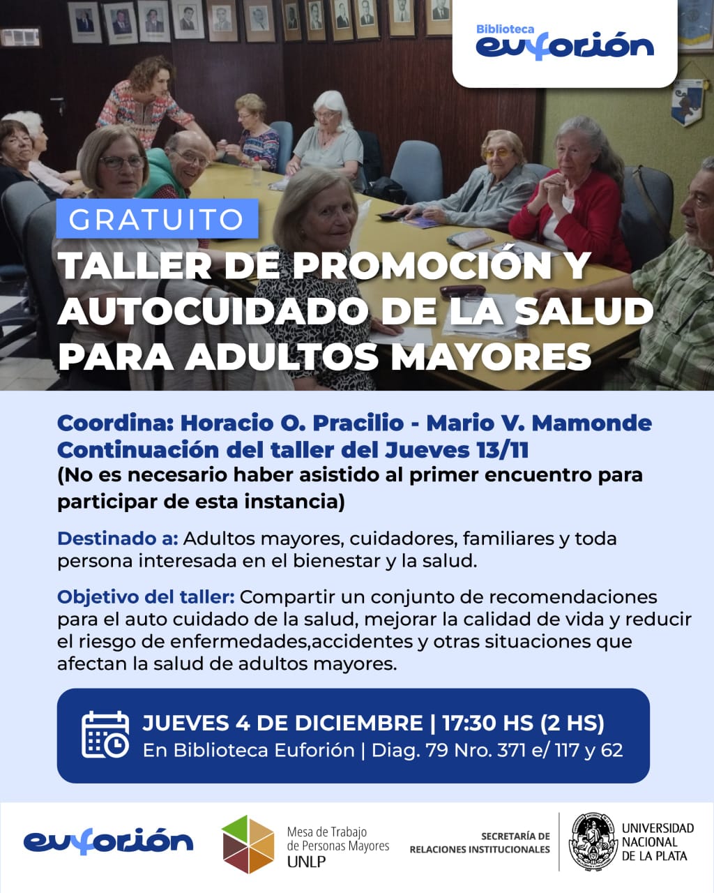 En el marco del convenio acordado entre la Secretaría de Relaciones Institucionales de la UNLP, a través de la Mesa de Trabajo de Personas Mayores, y la Biblioteca Euforión, el pasado jueves 13 de noviembre, se llevó adelante el Taller de Promoción y Autocuidado de la Salud para Adultos Mayores. En el encuentro, que tuvo lugar en la sede de Euforión, se proporcionaron conocimientos de salud, prácticas corporales y una guía de autocuidado para mejorar la calidad de vida y reducir el riesgo de enfermedades, accidentes y otras situaciones que afectan la salud de los adultos mayores, además de controles básicos de salud optativos y recomendaciones específicas a nivel individual y/o familiar.