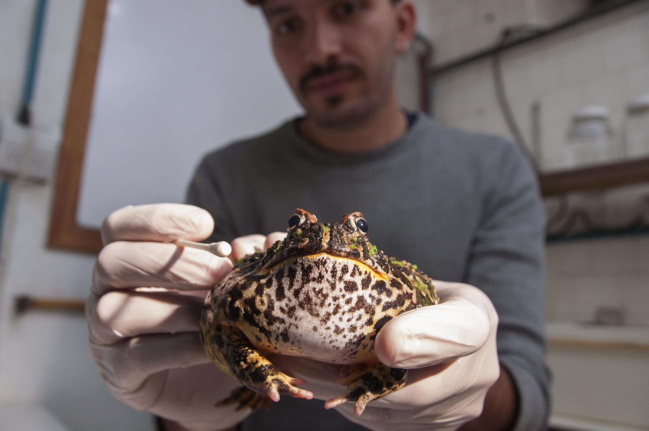 Guillermo Natale se acercó a la carrera de zoología de la Facultad de Ciencias Naturales y Museo de la UNLP para estudiar a los axolotes, motivado por un cuento de Cortázar. Ante la ausencia de estos animales en nuestro país, se inclinó por la especie local más parecida: anfibios sin cola o anuros. Actualmente Natale es doctor en Ciencias Naturales y trabaja en el Centro de Investigaciones del Medioambiente (CIM) dependiente de la Facultad de Ciencias Exactas de la Universidad Nacional de La Plata y el CONICET. Ha estado investigando ranas, sapos y escuerzos durante más de 25 años y actualmente dirige un grupo especializado en ecotoxicología de anfibios, su estado de salud, conservación y el efecto que los diferentes factores de estrés ambiental, producto de las actividades antrópicas, provocan sobre ellos.