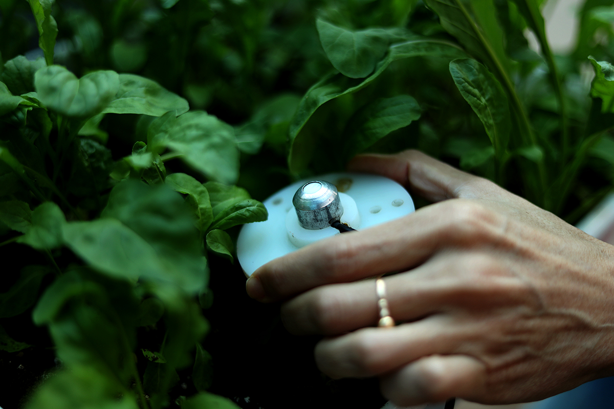 “Una vez en el laboratorio, los vegetales cosechados se dividen en grupos tal que siempre tendremos un conjunto de muestras que no recibirán ningún tratamiento (muestras control) y varios conjuntos de muestras que serán tratadas con diferentes combinaciones tiempo /intensidad de luz. Diariamente controlamos la pérdida de peso y medimos el color superficial con un colorímetro, que es un equipo que permite cuantificar el color, recordar que uno de los síntomas evidentes de la senescencia es el amarillamiento de los vegetales”.