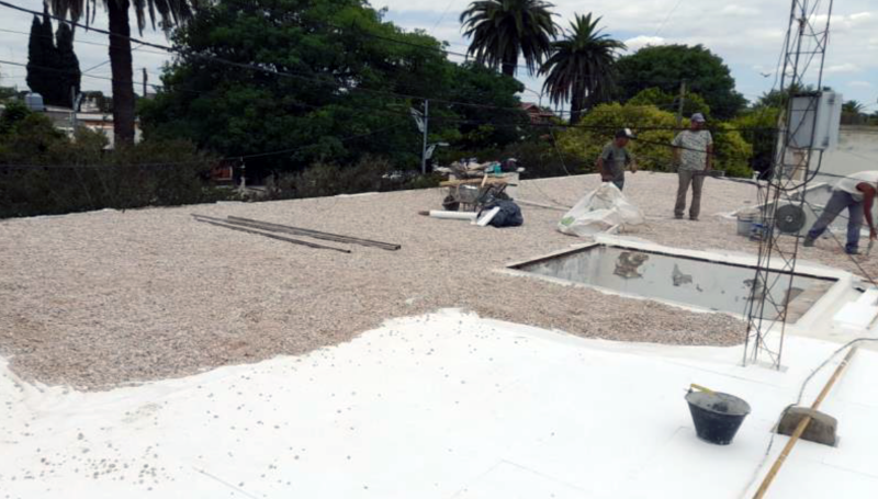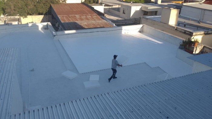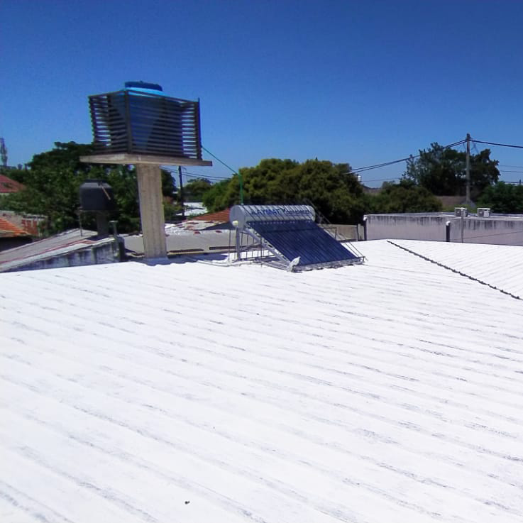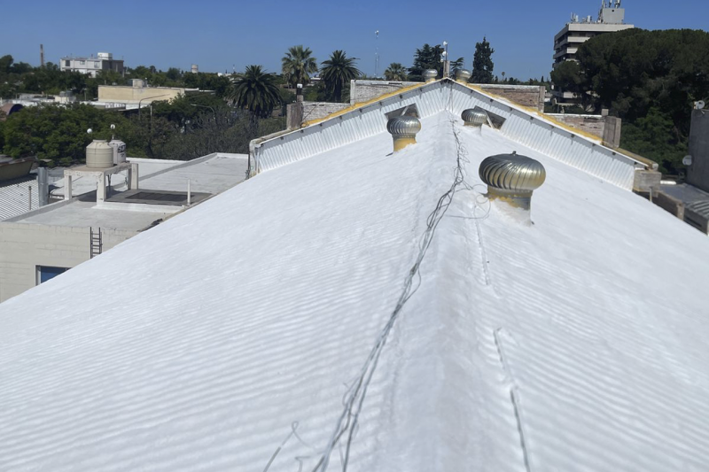 El tratamiento con spray de poliuretano forma un manto aislante monolítico, totalmente adherido a la superficie, sin juntas ni puentes térmicos. La alta capacidad aislante de este material se debe a la muy baja conductividad térmica que posee el gas espumante, ocluido en el interior de sus celdas cerradas. Como la espuma de poliuretano no debe quedar expuesta a la intemperie porque la humedad y los rayos UV causan su degradación progresiva, se lo protege con 2 manos de pintura acrílica de base acuosa libre de solventes de color blanco.