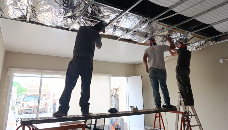 La colocación sobre el cielorraso de un fieltro de 8 a 10 cm de lana de vidrio, recubierto en una de sus caras con foil de aluminio liso y una solapa de 10 cm para garantizar la continuidad, constituye un sistema de aislamiento térmico y acústico aplicado en techos para mejorar el rendimiento energético de los edificios.